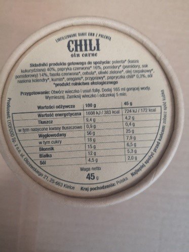 Nombre del producto (en etiqueta): Chili sin carne